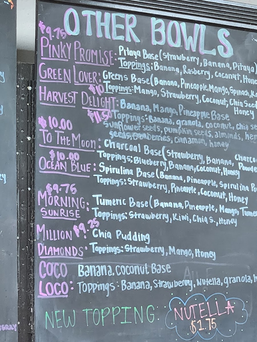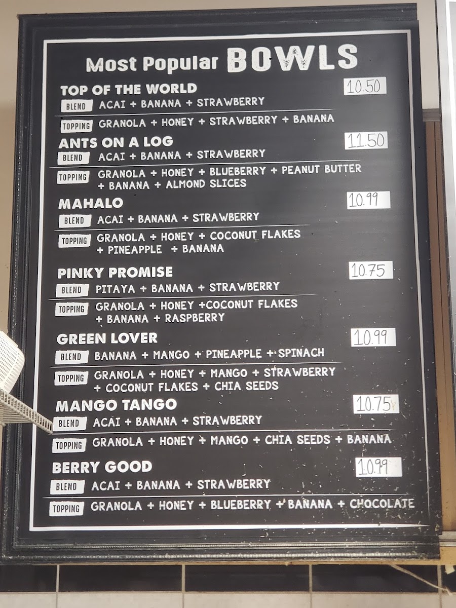- Popular Bowls: This section includes customer favorites such as Top Of The World, Ants On A Log, Mahalo, Pinky Promise, Green Lover, Mango Tango, and Berry Good. These bowls typically combine acai or other fruit bases with assorted toppings and flavor combinations.