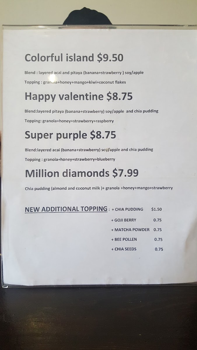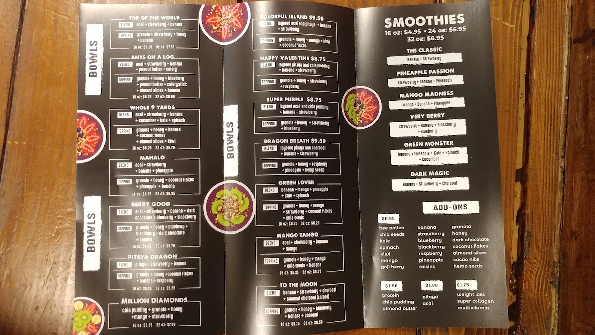 Visitors typically use the menu for quick, casual orders that can serve as nutritious breakfast options, midday refreshments, or light meals. Selections are made easy by clearly defined categories that highlight both classic and signature bowl preparations alongside fresh juice choices.