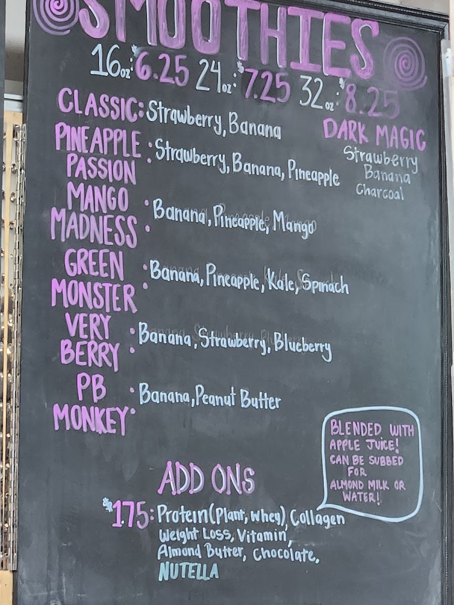 - Others: This extensive category contains various names suggesting different juice blends, smoothie flavors, and bowl bases including Dark Magic, Pineapple, Passion, Mango Madness, Green Monster, Acai Base, and many more.